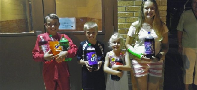 Here it is!! The annual picture of the kids with two liters of pop! Let me explain. Each year Brian’s parents’ church has an Ice Cream Social which is a carnival event that raises money for Christ The King school in Kansas City, KS. For years we have taken our kids and the ring toss to win two-liters of pop always seems to stick in everyone’s memory! It always has the longest line and somehow the kids are successful at that particular game and we find ourselves loaded down with two-liters. The funny thing is…we don’t even drink pop! Hey-it’s all about the victory, success, and skill at throwing a ring over the top of a bottle of pop. Just days ago when I was reminding kids about the upcoming weekend events and the social..I just said…”remember the games you play in the parking lot of Grandma’s church and you always win two-liters of pop” Ohhhh yes, we love that night! It’s also a high light for Grandma and Grandpa. They always look forward to it and this one was particularly special because it happened to fall on their 50th wedding anniversary! For them, the perfect way to celebrate is to be with grandkids so what a great night! Happy Anniversary!