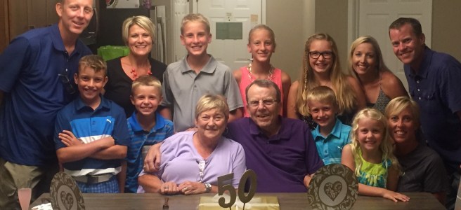 Look at these cuties!! This is Helena and Frank, Brian’s parents on their wedding day 50 years ago! To celebrate this very special occasion, we took a family trip to Branson for the weekend. These two really never ask for much, just gathering all of their kids together makes them so happy. We had a great time spoiling them for a couple days! John, Dawn, and the kids were able to come and Jennifer. It was a heat index of 110 I think, but that didn’t stop us from celebrating! Of course this included lots of swimming at the beautiful Marriott Willow Ridge resort (our hair will never recover from the massive chlorine intake). We had 3, 2 bedroom/2 bath suites equipped with full kitchens right by the pool. It was perfect!
