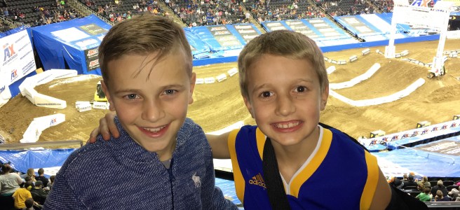 My sister kindly gave us tickets to Arenacross in the Hallmark Suite at the Sprint Center Saturday night. I jumped at the chance to take Drew to do something fun to get his mind off of his wrist injury! I didn’t really know what to expect but we filled up my van with little boys and ventured down town. I quickly discovered that Arenacross in pretty fierce! These riders are fearless and pretty talented athletes that race on an indoor dirt track. I can’t believe how high they fly off those jumps! And quite honestly, I’m mesmerized by the fact that they can transform the Sprint Center into a dirt pit and then turn around and make it an ice rink, or a basketball court, or a concert venue. These cuties had the best time! Love you Drew Boo and thank you Aunt Shauna!